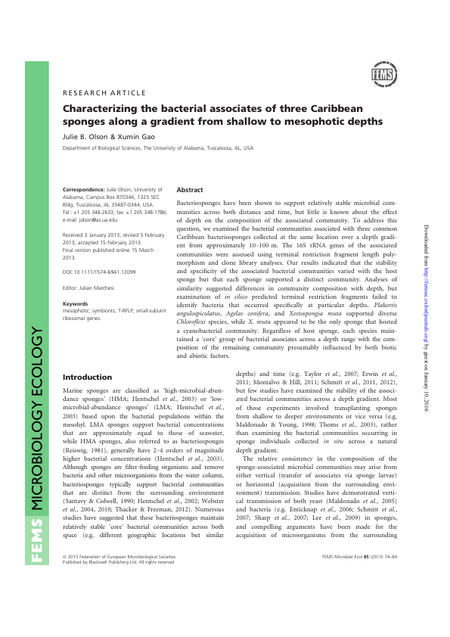 Bacteriosponges have been shown to support relatively stable microbial communities across both distance and time, but little is known about the effect of depth on the composition of the associated community. To address this question, we examined the bacterial communities associated with three common Caribbean bacteriosponges collected at the same location over a depth gradient from approximately 10-100 m. The 16S rRNA genes of the associated communities were assessed using terminal restriction fragment length polymorphism and clone library analyses. Our results indicated that the stability and specificity of the associated bacterial communities varied with the host sponge but that each sponge supported a distinct community. Analyses of similarity suggested differences in community composition with depth, but examination of in silico predicted terminal restriction fragments failed to identify bacteria that occurred specifically at particular depths. Plakortis angulospiculatus, Agelas conifera, and Xestospongia muta supported diverse Chloroflexi species, while X. muta appeared to be the only sponge that hosted a cyanobacterial community. Regardless of host sponge, each species maintained a 'core' group of bacterial associates across a depth range with the composition of the remaining community presumably influenced by both biotic and abiotic factors.
