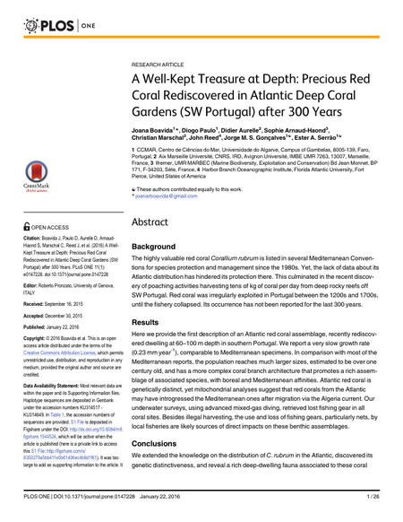 Background The highly valuable red coral Corallium rubrum is listed in several Mediterranean Conventions for species protection and management since the 1980s. Yet, the lack of data about its Atlantic distribution has hindered its protection there. This culminated in the recent discovery of poaching activities harvesting tens of kg of coral per day from deep rocky reefs off SW Portugal. Red coral was irregularly exploited in Portugal between the 1200s and 1700s, until the fishery collapsed. Its occurrence has not been reported for the last 300 years. Results Here we provide the first description of an Atlantic red coral assemblage, recently rediscovered dwelling at 60–100 m depth in southern Portugal. We report a very slow growth rate (0.23 mm year-1), comparable to Mediterranean specimens. In comparison with most of the Mediterranean reports, the population reaches much larger sizes, estimated to be over one century old, and has a more complex coral branch architecture that promotes a rich assemblage of associated species, with boreal and Mediterranean affinities. Atlantic red coral is genetically distinct, yet mitochondrial analyses suggest that red corals from the Atlantic may have introgressed the Mediterranean ones after migration via the Algeria current. Our underwater surveys, using advanced mixed-gas diving, retrieved lost fishing gear in all coral sites. Besides illegal harvesting, the use and loss of fishing gears, particularly nets, by local fisheries are likely sources of direct impacts on these benthic assemblages. Conclusions We extended the knowledge on the distribution of C. rubrum in the Atlantic, discovered its genetic distinctiveness, and reveal a rich deep-dwelling fauna associated to these coral assemblages. These findings support a barrier role of the Atlantic-Mediterranean transition zone, but reveal also hints of connectivity along its southern margin. The results highlight the genetic and demographic uniqueness of red coral populations from SW Iberia. However, we also report threats to these vulnerable populations by direct and indirect fishing activities and argue that its protection from any mechanically destructive activities is urgent as a precautionary approach. This study advances our understanding of phylogeographic barriers and range edge genetic diversity, and serves as a baseline against which to monitor future human and environmental disturbances to Atlantic C. rubrum.