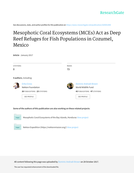 Mesophotic Coral Ecosystems (MCEs; 30 – 150 m deep reefs) may provide natural refuges for fisheries targeted species by virtue of their depth. We surveyed shallow reefs and MCEs around Cozumel, Mexico including sites inside and outside a protected area. Our results suggest fish communities shifts across the depth gradient are affected by protection levels. Greater overall fish biomass, with larger body lengths of commercially valuable fish, were found in the shallows within the marine park than in areas with no protection. On MCEs however, fish biomass and commercially valuable fish body lengths were similar regardless of protection; implying deep reef areas act as natural refuges. These findings highlight the need to integrate fish populations on MCEs into current reef fisheries management plans.