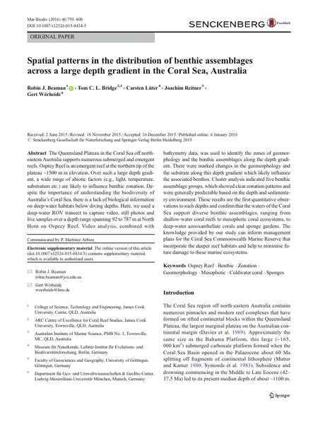 The Queensland Plateau in the Coral Sea off northeastern Australia supports numerous submerged and emergent reefs. Osprey Reef is an emergent reef at the northern tip of the plateau ~1500 m in elevation. Over such a large depth gradient, a wide range of abiotic factors (e.g., light, temperature, substratum etc.) are likely to influence benthic zonation. Despite the importance of understanding the biodiversity of Australia’s Coral Sea, there is a lack of biological information on deep-water habitats below diving depths. Here, we used a deep-water ROV transect to capture video, still photos and live samples over a depth range spanning 92 to 787 m at North Horn on Osprey Reef. Video analysis, combined with bathymetry data, was used to identify the zones of geomorphology and the benthic assemblages along the depth gradient. There were marked changes in the geomorphology and the substrate along this depth gradient which likely influence the associated benthos. Cluster analysis indicated five benthic assemblage groups, which showed clear zonation patterns and were generally predictable based on the depth and sedimentary environment. These results are the first quantitative observations to such depths and confirm that the waters of the Coral Sea support diverse benthic assemblages, ranging from shallow-water coral reefs to mesophotic coral ecosystems, to deep-water azooxanthellate corals and sponge gardens. The knowledge provided by our study can inform management plans for the Coral Sea Commonwealth Marine Reserve that incorporate the deeper reef habitats and help to minimise future damage to these marine ecosystems.