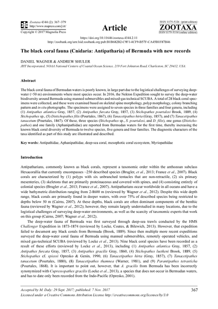 The black coral fauna of Bermudan waters is poorly known, in large part due to the logistical challenges of surveying deepwater (>50 m) environments where most species occur. In 2016, the Nekton Expedition sought to survey the deep-water biodiversity around Bermuda using manned submersibles and mixed-gas technical SCUBA. A total of 28 black coral specimens were collected, and these were examined based on skeletal spine morphology, polyp morphology, colony branching pattern and in situ photographs. The specimens were assigned to seven species in three families and four genera, including (1) Antipathes atlantica Gray, 1857, (2) Antipathes furcata Gray, 1857, (3) Stichopathes pourtalesi Brook, 1889, (4) Stichopathes sp., (5) Distichopathes filix (Pourtales, 1867), (6) Tanacetipathes hirta (Gray, 1857), and (7) Tanacetipathes tanacetum (Pourtales, 1867). Of these, three species (Stichopathes sp., S. pourtalesi, and D. filix), one genus (Distichopathes) and one family (Aphanipathidae) are reported from Bermudan waters for the first time, thereby increasing the known black coral diversity of Bermuda to twelve species, five genera and four families. The diagnostic characters of the taxa identified as part of this study are illustrated and described.