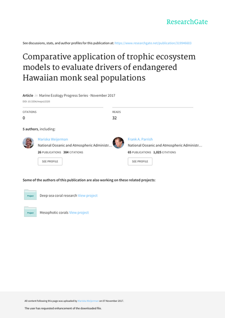 The Northwestern Hawaiian Islands share comparable biological community structures and have similar histories of fishing pressure, yet monk seal subpopulations show different trends of decline between locations. Using trophic models, we compared ecosystem structure and energy flows supporting 2 subpopulations (on Laysan Island and French Frigate Shoals (FFS) atoll), each with varied rates of decline (1998−2015). Through simulated perturbations, we showed that the Laysan community had much higher productivity and was mainly forced by bottom-up processes, but prey and predator abundance also controlled the energy flow and community structure. The FFS ecosystem was less productive and strongly influenced by a change in primary productivity. Although the FFS system responded to a change in predator and prey abundance, the monk seals were more influenced by benthic bottomfish biomass than by a change in predator abundance. We clarified the role of external drivers (Pacific Decadal Oscillation [PDO] and benthic bottomfish fishery): while the PDO did show correlation with monk seal population trends, the best models were driven by prey biomass as impacted by bottomfish removals. However, monk seal predator and prey trophic dynamics were not sufficient to explain the observed decline in monk seal biomass. We suggest that other factors amplifying mortality played a role; for example, shark predation on monk seal pups at FFS. Because of the uncertainties inherent in a complex ecosystem model, the results cannot be used for tactical management but they can help direct management or future research efforts in the recovery of the endangered monk seal population.