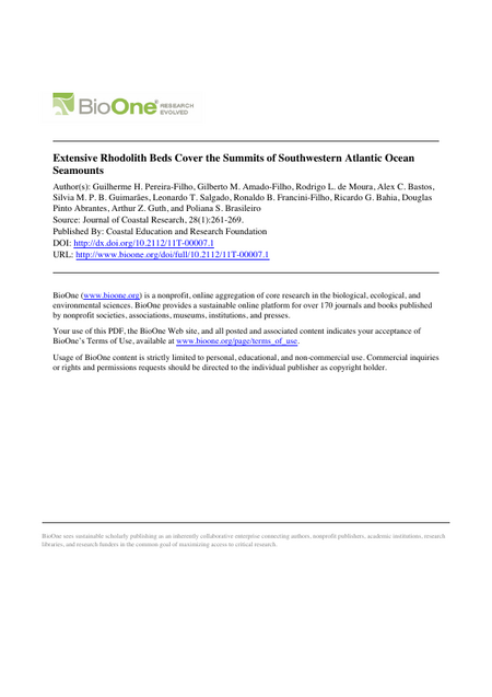 Calcium carbonate production by marine organisms is an essential process in the global budget of , and coralline reefs are the most important benthic carbonate producers. Crustose coralline algae (CCA) are well recognized as the most important carbonate builders in the tropical Brazilian continental shelf, forming structural reefs and extensive rhodolith beds. However, the distribution of CCA beds, as well as their role in mineralization in mesophotic communities and isolated carbonate banks, is still poorly known. To characterize the bottom features of several seamount summits in the Southwestern Atlantic (SWA), side-scan sonar records, remotely operated vehicle imagery, and benthic samples with mixed-gas scuba diving were acquired during two recent research cruises (March 2009 and February 2011). The tops of several seamounts within this region are relatively shallow (∼60 m), flat, and dominated by rhodolith beds (Vitória, Almirante Saldanha, Davis, and Jaseur seamounts, as well as the Trindade Island shelf). On the basis of abundance, dimensions, vitality, and growth rates of CCA nodules, a mean CaCO3 production was estimated, ranging from 0.4 to 1.8 kg m−2 y−1, with a total production reaching 1.5 × 10−3 Gt y−1. Our results indicate that these SWA seamount summits provide extensive areas of shallow reef area and represent 0.3% of the world's carbonate banks. The importance of this habitat has been highly neglected, and immediate management needs must be fulfilled in the short term to ensure long-term persistence of the ecosystem services provided by these offshore carbonate realms.