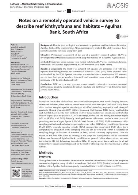 Background: Despite their ecological and economic importance, reef habitats on the central Agulhas Bank, off the southern tip of Africa, remain poorly studied. The ichthyofauna of these habitats cannot be surveyed using trawl gear. Objective: Preliminary assessment of the use of a remotely operated vehicle (ROV) to investigate the ichthyofauna associated with deep reef habitats on the central Agulhas Bank. Method: Underwater visual surveys were carried out during ROV dives (maximum duration 60 minutes; area covered approximately 800 m2 ; maximum dive depth 100 m). Results & discussion: The number of detected fish species (36) compares well with that reported from fishing surveys and commercial fisher data. Most (68%) fishes appeared to be undisturbed by the ROV. Species saturation was reached after a maximum of 135 minutes survey time, but species numbers increased and saturation times shortened (34 minutes minimum) with the introduction of bait. Conclusion: ROV surveys may represent a non-extractive alternative to assess demersal ichthyofaunal diversity in relation to habitat structure and benthic cover on temperate reefs around South Africa.