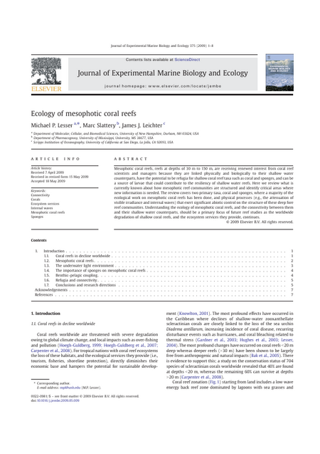 Mesophotic coral reefs, reefs at depths of 30 m to 150 m, are receiving renewed interest from coral reef scientists and managers because they are linked physically and biologically to their shallow water counterparts, have the potential to be refugia for shallow coral reef taxa such as coral and sponges, and can be a source of larvae that could contribute to the resiliency of shallow water reefs. Here we review what is currently known about how mesophotic reef communities are structured and identify critical areas where new information is needed. The review covers two primary taxa, coral and sponges, where a majority of the ecological work on mesophotic coral reefs has been done, and physical processes (e.g., the attenuation of visible irradiance and internal waves) that exert significant abiotic control on the structure of these deep fore reef communities. Understanding the ecology of mesophotic coral reefs, and the connectivity between them and their shallow water counterparts, should be a primary focus of future reef studies as the worldwide degradation of shallow coral reefs, and the ecosystem services they provide, continues.