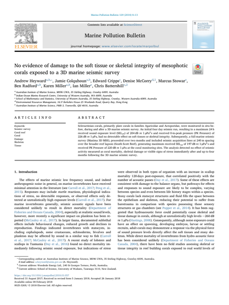 Scleractinian corals, primarily plate corals in families Agaricidae and Acroporidae, were monitored in situ before, during and after a 3D marine seismic survey. An initial four day seismic run, resulting in a maximum 24 h received sound exposure level (SEL24) of 204 dB re 1 μPa2·s and received 0-to-peak pressure (PK Pressure) of 226 dB re 1 μPa, had no detectable effect on soft tissues or skeletal integrity. Subsequently, a full marine seismic survey (Maxima 3D MSS), proceeded over two months and included seismic acquisition lines at 240 m spacing over the broader reef lagoon (South Scott Reef), generating maximum received SEL24 of 197 dB re 1 μPa2·s and received PK Pressure of 220 dB re 1 μPa at the coral monitoring sites. The analysis detected no effect of seismic activity measured as coral mortality, skeletal damage or visible signs of stress immediately after and up to four months following the 3D marine seismic survey.