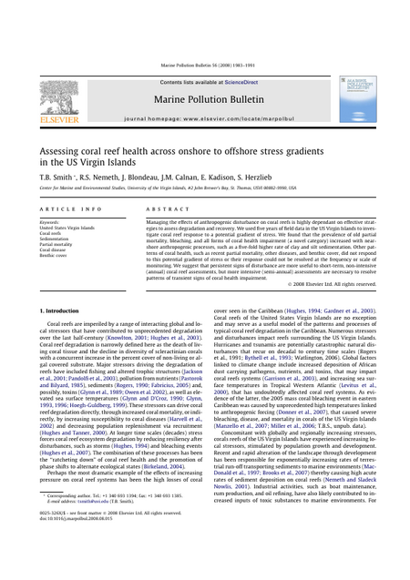 Managing the effects of anthropogenic disturbance on coral reefs is highly dependant on effective strategies to assess degradation and recovery. We used five years of field data in the US Virgin Islands to investigate coral reef response to a potential gradient of stress. We found that the prevalence of old partial mortality, bleaching, and all forms of coral health impairment (a novel category) increased with nearshore anthropogenic processes, such as a five-fold higher rate of clay and silt sedimentation. Other patterns of coral health, such as recent partial mortality, other diseases, and benthic cover, did not respond to this potential gradient of stress or their response could not be resolved at the frequency or scale of monitoring. We suggest that persistent signs of disturbance are more useful to short-term, non-intensive (annual) coral reef assessments, but more intensive (semi-annual) assessments are necessary to resolve patterns of transient signs of coral health impairment.