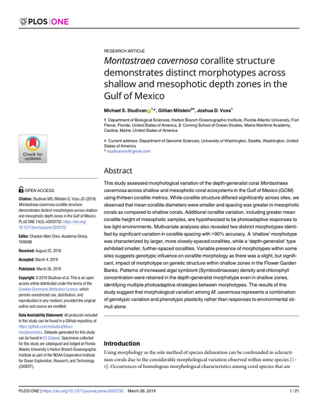 This study assessed morphological variation of the depth-generalist coral Montastraea cavernosa across shallow and mesophotic coral ecosystems in the Gulf of Mexico (GOM) using thirteen corallite metrics. While corallite structure differed significantly across sites, we observed that mean corallite diameters were smaller and spacing was greater in mesophotic corals as compared to shallow corals. Additional corallite variation, including greater mean corallite height of mesophotic samples, are hypothesized to be photoadaptive responses to low light environments. Multivariate analyses also revealed two distinct morphotypes identified by significant variation in corallite spacing with >90% accuracy. A ‘shallow’ morphotype was characterized by larger, more closely-spaced corallites, while a ‘depth-generalist’ type exhibited smaller, further-spaced corallites. Variable presence of morphotypes within some sites suggests genotypic influence on corallite morphology as there was a slight, but significant, impact of morphotype on genetic structure within shallow zones in the Flower Garden Banks. Patterns of increased algal symbiont (Symbiodiniaceae) density and chlorophyll concentration were retained in the depth-generalist morphotype even in shallow zones, identifying multiple photoadaptive strategies between morphotypes. The results of this study suggest that morphological variation among M. cavernosa represents a combination of genotypic variation and phenotypic plasticity rather than responses to environmental stimuli alone.