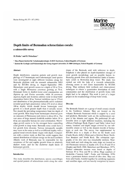 Depth distribution, zonation pattern and growth morphology of 17 hermatypic and 4 ahermatypic coral species were investigated at eight different locations along the Bermuda platform with the research submersible GEO and by SCUBA diving in August–September 1983. Hermatypic coral growth occurs to a depth of 50 to 70 m, with a single Montastrea cavernosa growing at 78 m. Dominant forms in shallow-water coral communities are Diploria sp. and Porites astreoides, while M. cavernosa, Agaricia fragilis and Scolymia cubensis occur in deep-water associations below 60 m. Vertical visibilities (up to 178 m) and distribution of the photosynthetically active radiation revealed good light penetration values (1% level at about 100 m depth), which should favour hermatypic coral growth to a much greater depth than it actually occurs. Nor should the prevailing temperatures limit the depth of coral growth. Most deep-water hermatypes observed grow on remnants of Pleistocene reefs down to about 60 m. The vast areas of large massed rhodolith nodules below 50 to 60 m are unsuitable bottom for coral colonisation. Macroalgae growth seems to be the strongest factor controlling coral growth in deep water. Bermuda stony corals have a low growth form diversity. Various intraspecific morphs may occur at the same as well as at different depths, with a general trend towards flatter shapes with depth. Comparison with a similar study on Red Sea corals suggests that annual distribution of radiant energy on the most northern Atlantic reefs of Bermuda may be responsible for the occurrence of flat and cuplike growth forms in relatively shallow water, and for the shallower depth limits of hermatypic growth.
