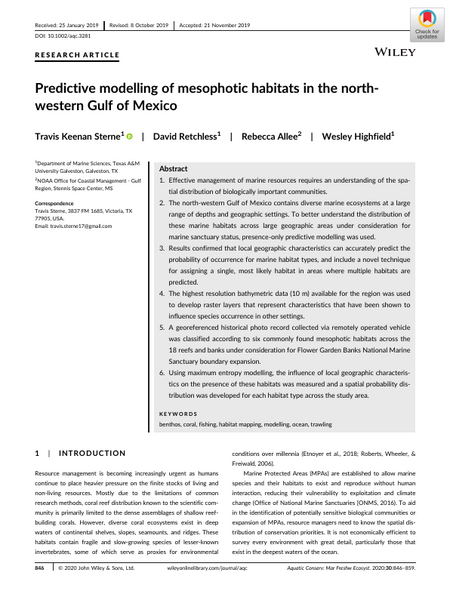1. Effective management of marine resources requires an understanding of the spa- tial distribution of biologically important communities. 2. The north-western Gulf of Mexico contains diverse marine ecosystems at a large range of depths and geographic settings. To better understand the distribution of these marine habitats across large geographic areas under consideration for marine sanctuary status, presence-only predictive modelling was used. 3. Results confirmed that local geographic characteristics can accurately predict the probability of occurrence for marine habitat types, and include a novel technique for assigning a single, most likely habitat in areas where multiple habitats are predicted. 4. The highest resolution bathymetric data (10 m) available for the region was used to develop raster layers that represent characteristics that have been shown to influence species occurrence in other settings. 5. A georeferenced historical photo record collected via remotely operated vehicle was classified according to six commonly found mesophotic habitats across the 18 reefs and banks under consideration for Flower Garden Banks National Marine Sanctuary boundary expansion. 6. Using maximum entropy modelling, the influence of local geographic characteris- tics on the presence of these habitats was measured and a spatial probability dis- tribution was developed for each habitat type across the study area.