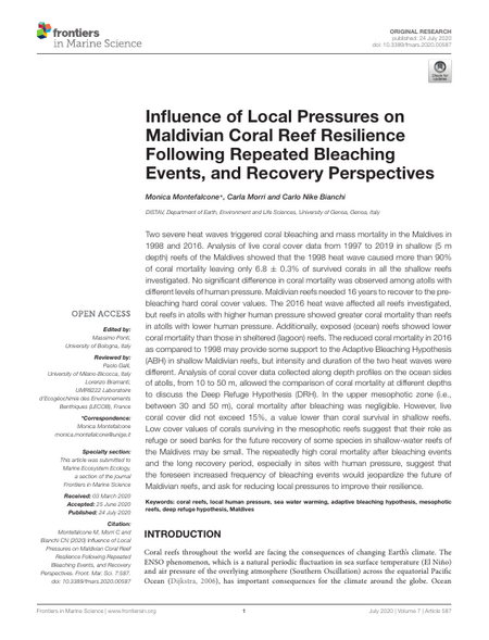 Two severe heat waves triggered coral bleaching and mass mortality in the Maldives in 1998 and 2016. Analysis of live coral cover data from 1997 to 2019 in shallow (5 m depth) reefs of the Maldives showed that the 1998 heat wave caused more than 90% of coral mortality leaving only 6.8 ± 0.3% of survived corals in all the shallow reefs investigated. No significant difference in coral mortality was observed among atolls with different levels of human pressure. Maldivian reefs needed 16 years to recover to the prebleaching hard coral cover values. The 2016 heat wave affected all reefs investigated, but reefs in atolls with higher human pressure showed greater coral mortality than reefs in atolls with lower human pressure. Additionally, exposed (ocean) reefs showed lower coral mortality than those in sheltered (lagoon) reefs. The reduced coral mortality in 2016 as compared to 1998 may provide some support to the Adaptive Bleaching Hypothesis (ABH) in shallow Maldivian reefs, but intensity and duration of the two heat waves were different. Analysis of coral cover data collected along depth profiles on the ocean sides of atolls, from 10 to 50 m, allowed the comparison of coral mortality at different depths to discuss the Deep Refuge Hypothesis (DRH). In the upper mesophotic zone (i.e., between 30 and 50 m), coral mortality after bleaching was negligible. However, live coral cover did not exceed 15%, a value lower than coral survival in shallow reefs. Low cover values of corals surviving in the mesophotic reefs suggest that their role as refuge or seed banks for the future recovery of some species in shallow-water reefs of the Maldives may be small. The repeatedly high coral mortality after bleaching events and the long recovery period, especially in sites with human pressure, suggest that the foreseen increased frequency of bleaching events would jeopardize the future of Maldivian reefs, and ask for reducing local pressures to improve their resilience. Keywords: coral reefs, local human pressure, sea water warming, adaptive bleaching hypothesis, mesophotic reefs, deep refuge hypothesis, Maldives.
