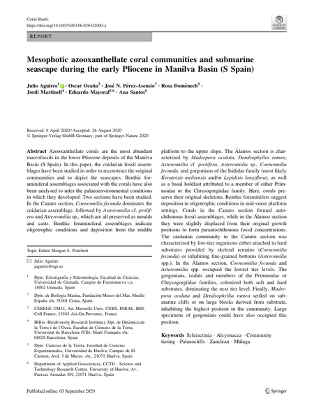 Azooxanthellate corals are the most abundant macrofossils in the lower Pliocene deposits of the Manilva Basin (S Spain). In this paper, the cnidarian fossil assemblages have been studied in order to reconstruct the original communities and to depict the seascapes. Benthic foraminiferal assemblages associated with the corals have also been analysed to infer the palaeoenvironmental conditions in which they developed. Two sections have been studied. In the Canuto section, Coenosmilia fecunda dominates the cnidarian assemblage, followed by Asterosmilia cf. prolifera and Asterosmilia sp., which are all preserved as moulds and casts. Benthic foraminiferal assemblages indicate oligotrophic conditions and deposition from the middle platform to the upper slope. The A´ lamos section is characterized by Madrepora oculata, Dendrophyllia ramea, Asterosmilia cf. prolifera, Asterosmilia sp., Coenosmilia fecunda, and gorgonians of the Isididae family (most likely Keratoisis melitensis and/or Lepidisis longiflora), as well as a basal holdfast attributed to a member of either Primnoidae or the Chrysogorgiidae family. Here, corals preserve their original skeletons. Benthic foraminifers suggest deposition in oligotrophic conditions in mid–outer platform settings. Corals in the Canuto section formed autochthonous fossil assemblages, while in the A´ lamos section they were slightly displaced from their original growth positions to form parautochthonous fossil concentrations. The cnidarian community in the Canuto section was characterized by low-tier organisms either attached to hard substrates provided by skeletal remains (Coenosmilia fecunda) or inhabiting fine-grained bottoms (Asterosmilia spp.). In the A´ lamos section, Coenosmilia fecunda and Asterosmilia spp. occupied the lowest tier levels. The gorgonians, isidids and members of the Primnoidae or Chrysogorgiidae families, colonized both soft and hard substrates, dominating the next tier level. Finally, Madrepora oculata and Dendrophyllia ramea settled on submarine cliffs or on large blocks derived from substrate, inhabiting the highest position in the community. Large specimens of gorgonians could have also occupied this position.