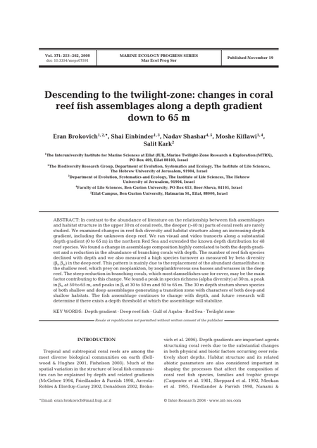 In contrast to the abundance of literature on the relationship between fish assemblages and habitat structure in the upper 30 m of coral reefs, the deeper (>40 m) parts of coral reefs are rarely studied. We examined changes in reef fish diversity and habitat structure along an increasing depth gradient, including the unknown deep reef. We ran visual and video transects along a substantial depth gradient (0 to 65 m) in the northern Red Sea and extended the known depth distribution for 48 reef species. We found a change in assemblage composition highly correlated to both the depth gradient and a reduction in the abundance of branching corals with depth. The number of reef fish species declined with depth and we also measured a high species turnover as measured by beta diversity (βt,βw) in the deep reef. This pattern is mainly due to the replacement of the abundant damselfishes in the shallow reef, which prey on zooplankton, by zooplanktivorous sea basses and wrasses in the deep reef. The steep reduction in branching corals, which most damselfishes use for cover, may be the main factor contributing to this change. We found a peak in species richness (alpha diversity) at 30 m, a peak in βwat 50 to 65 m, and peaks in βtat 30 to 50 m and 50 to 65 m. The 30 m depth stratum shows species of both shallow and deep assemblages generating a transition zone with characters of both deep and shallow habitats. The fish assemblage continues to change with depth, and future research will determine if there exists a depth threshold at which the assemblage will stabilize.