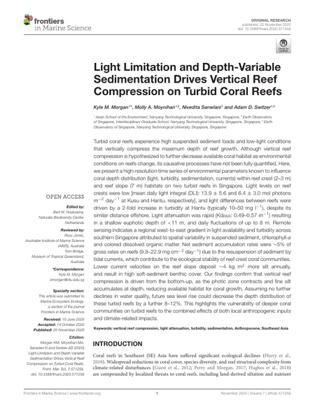 Turbid coral reefs experience high suspended sediment loads and low-light conditions that vertically compress the maximum depth of reef growth. Although vertical reef compression is hypothesized to further decrease available coral habitat as environmental conditions on reefs change, its causative processes have not been fully quantified. Here, we present a high-resolution time series of environmental parameters known to influence coral depth distribution (light, turbidity, sedimentation, currents) within reef crest (2–3 m) and reef slope (7 m) habitats on two turbid reefs in Singapore. Light levels on reef crests were low [mean daily light integral (DLI): 13.9 ± 5.6 and 6.4 ± 3.0 mol photons m–2 day–1 at Kusu and Hantu, respectively], and light differences between reefs were driven by a 2-fold increase in turbidity at Hantu (typically 10–50 mg l–1), despite its similar distance offshore. Light attenuation was rapid (KdPAR: 0.49–0.57 m–1) resulting in a shallow euphotic depth of <11 m, and daily fluctuations of up to 8 m. Remote sensing indicates a regional west-to-east gradient in light availability and turbidity across southern Singapore attributed to spatial variability in suspended sediment, chlorophyll-a and colored dissolved organic matter. Net sediment accumulation rates were ∼5% of gross rates on reefs (9.8–22.9 mg cm–2 day–1) due to the resuspension of sediment by tidal currents, which contribute to the ecological stability of reef crest coral communities. Lower current velocities on the reef slope deposit ∼4 kg m2 more silt annually, and result in high soft-sediment benthic cover. Our findings confirm that vertical reef compression is driven from the bottom-up, as the photic zone contracts and fine silt accumulates at depth, reducing available habitat for coral growth. Assuming no further declines in water quality, future sea level rise could decrease the depth distribution of these turbid reefs by a further 8–12%. This highlights the vulnerability of deeper coral communities on turbid reefs to the combined effects of both local anthropogenic inputs and climate-related impacts.