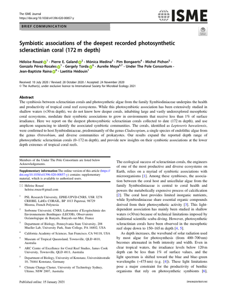 The symbiosis between scleractinian corals and photosynthetic algae from the family Symbiodiniaceae underpins the health and productivity of tropical coral reef ecosystems. While this photosymbiotic association has been extensively studied in shallow waters (<30 m depth), we do not know how deeper corals, inhabiting large and vastly underexplored mesophotic coral ecosystems, modulate their symbiotic associations to grow in environments that receive less than 1% of surface irradiance. Here we report on the deepest photosymbiotic scleractinian corals collected to date (172 m depth), and use amplicon sequencing to identify the associated symbiotic communities. The corals, identified as Leptoseris hawaiiensis, were confirmed to host Symbiodiniaceae, predominantly of the genus Cladocopium, a single species of endolithic algae from the genus Ostreobium, and diverse communities of prokaryotes. Our results expand the reported depth range of photosynthetic scleractinian corals (0–172 m depth), and provide new insights on their symbiotic associations at the lower depth extremes of tropical coral reefs.